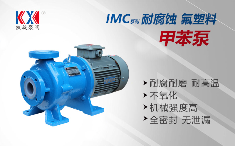 IMC型甲苯泵,過流部件使用氟塑料及合金復(fù)合材料制造,是應(yīng)用磁力學(xué)原理,利用內(nèi)外永磁體傳動,實現(xiàn)扭矩?zé)o接觸傳遞,當(dāng)電動機帶動外轉(zhuǎn)子總成旋轉(zhuǎn)時,通過磁場的作用磁力線穿過隔離套帶動內(nèi)轉(zhuǎn)子總成和葉輪同步旋轉(zhuǎn),外轉(zhuǎn)子旋轉(zhuǎn)時隔離套靜止,隔離套將介質(zhì)完全密封,從而達到無泄漏輸送介質(zhì)的目的。解決了機械傳動泵的軸封跑、冒、滴現(xiàn)象。非常適合輸送任意濃度的酸、堿、有機溶劑、易燃易爆和貴重液體等。