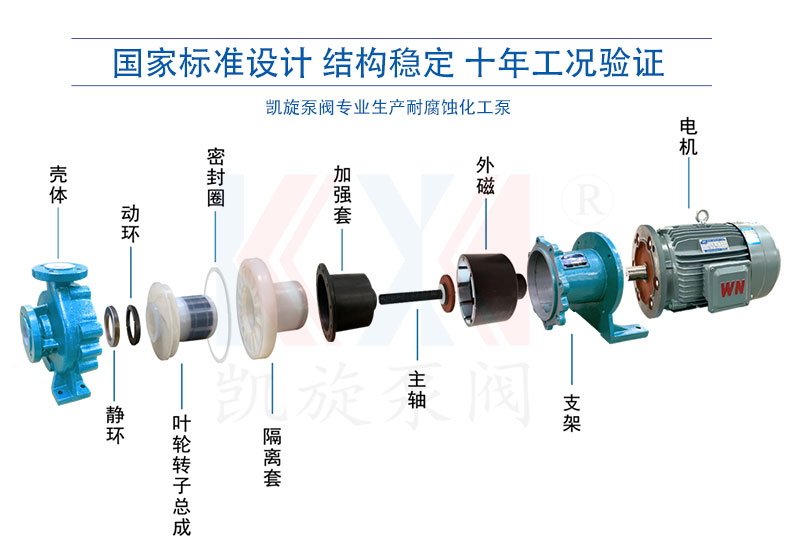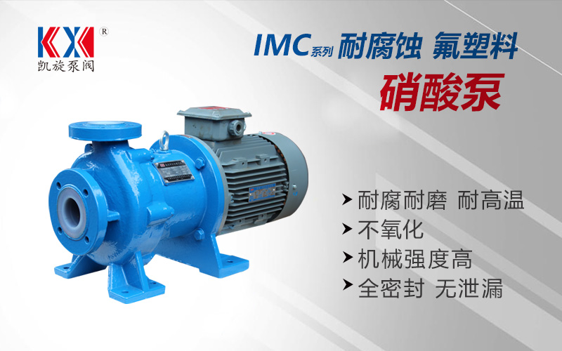 IMC硝酸泵,利用內(nèi)外永磁體傳動(dòng),實(shí)現(xiàn)扭矩?zé)o接觸傳遞,當(dāng)電動(dòng)機(jī)帶動(dòng)外轉(zhuǎn)子總成旋轉(zhuǎn)時(shí),通過(guò)磁場(chǎng)的作用磁力線(xiàn)穿過(guò)隔離套帶動(dòng)內(nèi)轉(zhuǎn)子總成和葉輪同步旋轉(zhuǎn),隔離套將介質(zhì)完全密封,從而達(dá)到無(wú)泄漏輸送介質(zhì)的目的。過(guò)流部件采用氟塑料及高純度碳化硅制成,具有良好的耐腐蝕性和密封性,安全無(wú)泄漏是輸送硝酸的很好選擇。選配時(shí),1、密封圈選擇包氟圈或四氟圈;2、轉(zhuǎn)子和隔離套更換成PFA,普通的FEP在硝酸中會(huì)有溶脹變型。