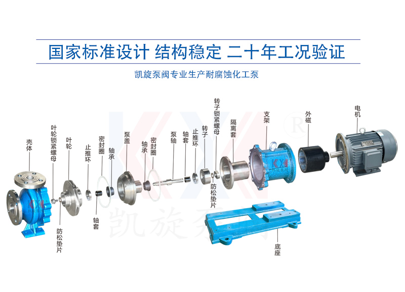 泵與電動機共用基座,大幅增強運轉穩定性,流道采用CFX、CFD技術得到高性能水力模型,使泵的效率明顯提高,內外磁轉子使用高磁積能、高矯頑力的稀土永磁制造,磁性不會隨著時間的推移而產生老化退磁現象,對磨部件選用不銹鋼對合金材料,其高硬度保證了磨損率,有效延長了易損件的使用壽命。